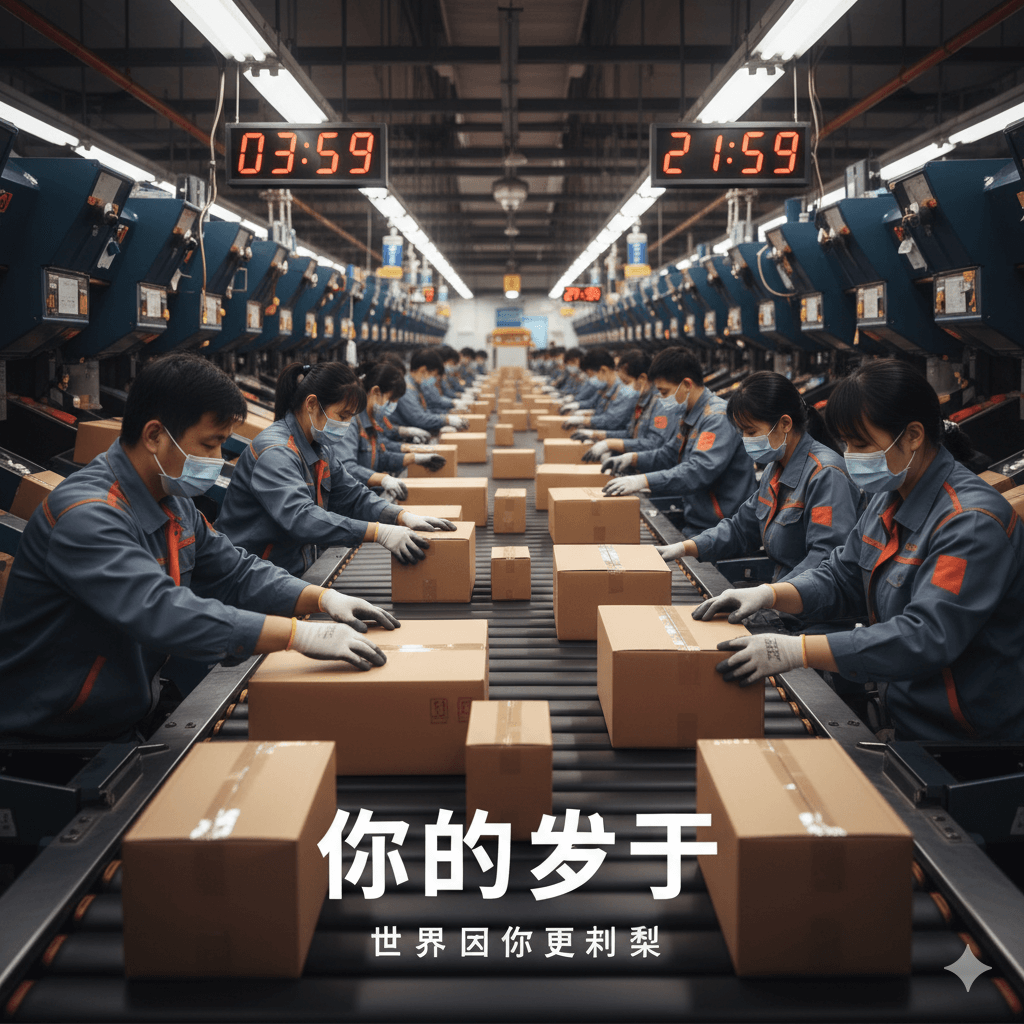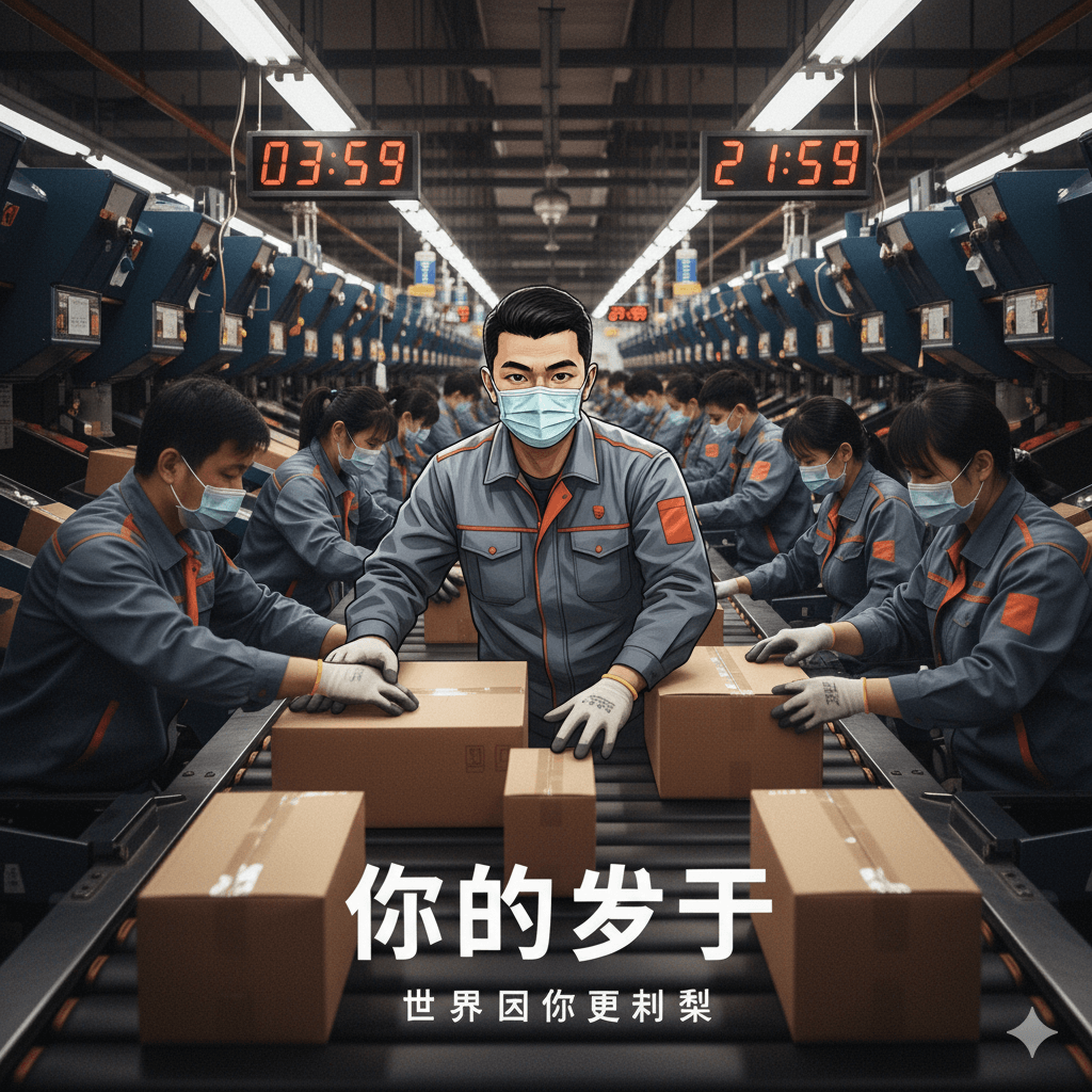 “一张宣传海报,背景是快递流水线上996的分拣小能手,图片下部居中两行字:‘你的样子’和‘世界因你更精彩’,上下排列,上面一行字号很大,下面一行字号很小?“于是,我把提示词发给了 Nano Banana,它生成出了下面这个: