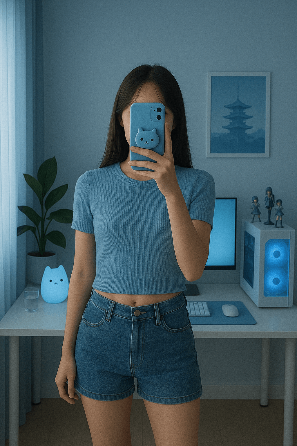 - 下装: 牛仔超短裤,两侧臀部各有一个蓝色缎带蝴蝶结